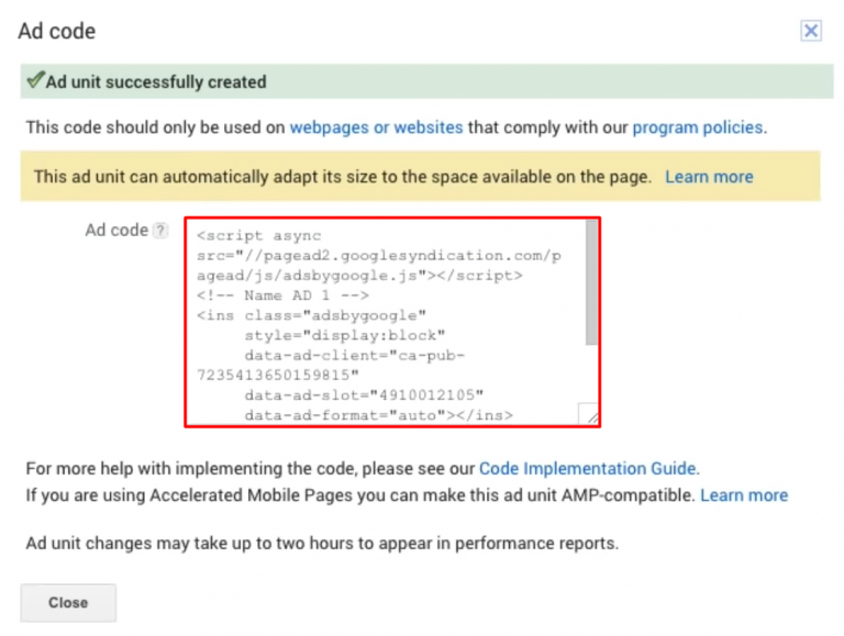 - Klik Simpan dan dapatkan kode. Anda akan melihat jendela baru dengan kode AdSense seperti ini: