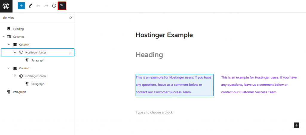 Nah, untuk mempermudah proses ini, editor WordPress Gutenberg memiliki opsi Block List View (daftar block) agar Anda bisa melihat setiap block yang sedang disusun, termasuk nested block dengan indentasi menjorok ke dalam. Cukup klik tombol List View di toolbar atas.