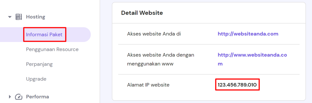 Informasi alamat IP Anda bisa dilihat melalui menu Hosting -> Informasi Paket di sisi kiri dashboard hPanel.