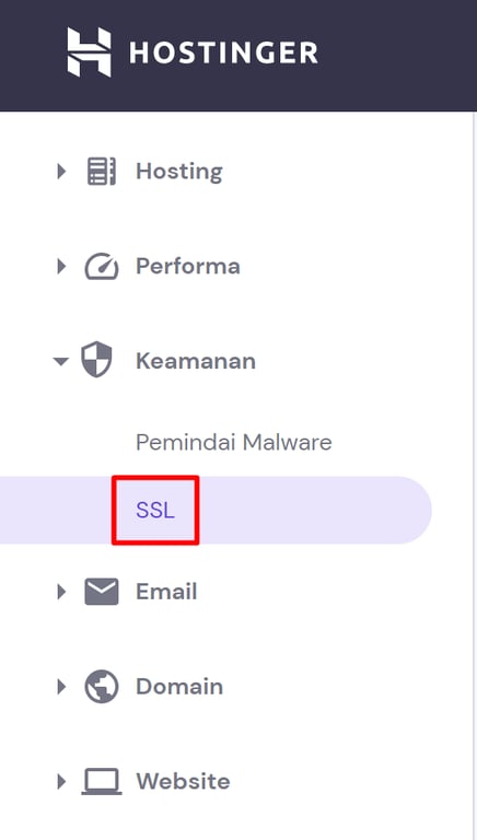 Kembali ke dashboard hPanel, cari menu Keamanan -> SSL di sidebar kiri hPanel untuk mengecek status sertifikat SSL Anda.