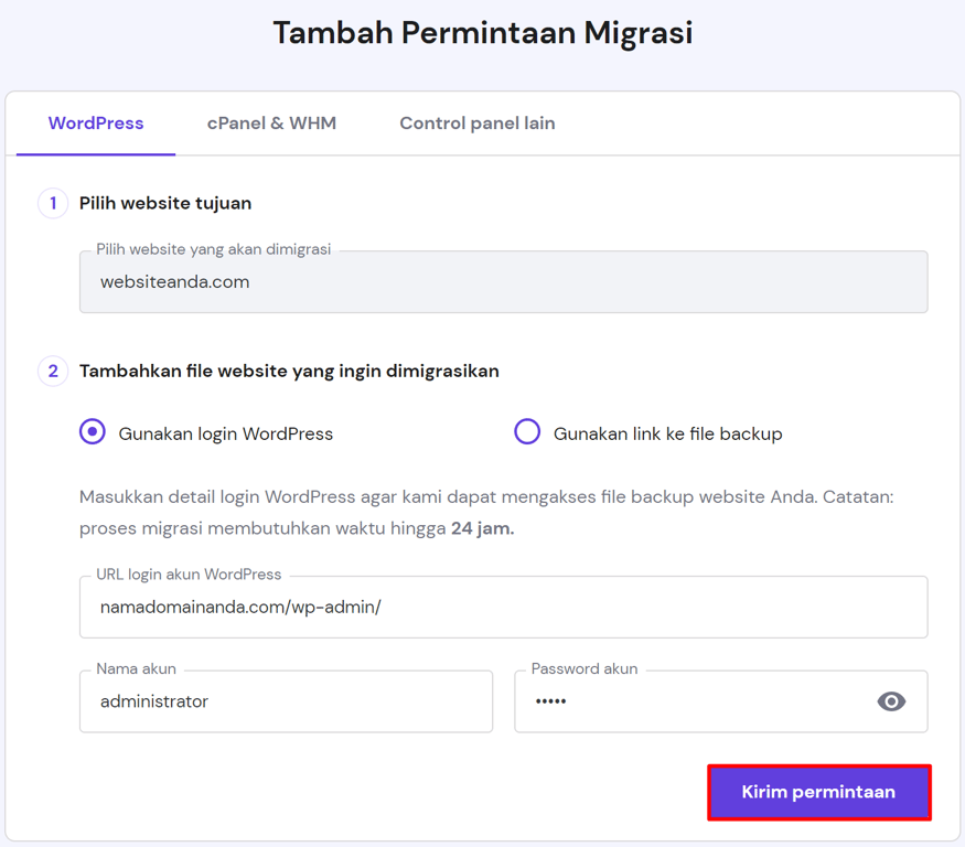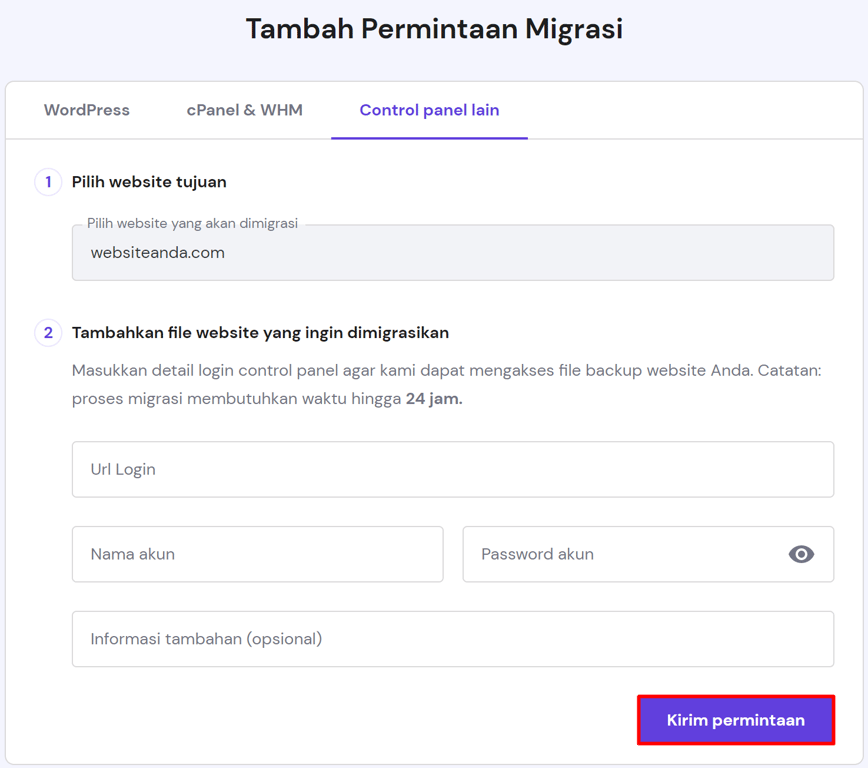 Kalau akan memindahkan website dari cPanel dengan penyedia hosting sebelumnya, pilih opsi cPanel & WHM. Isi semua kolom lalu klik Kirim permintaan untuk memulai prosesnya. Ingat, migrasi website cPanel saat ini tidak menyertakan email.