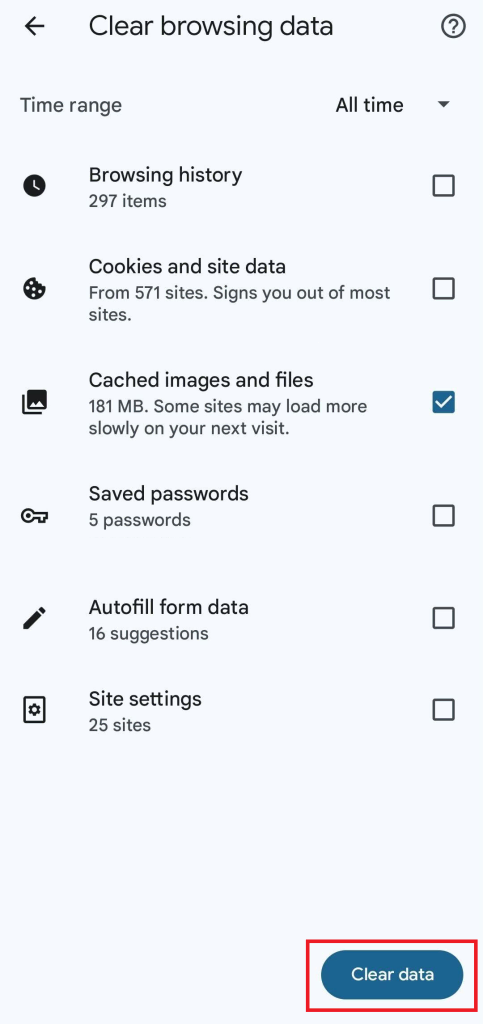 - Ketuk Clear Data (Hapus data) untuk membersihkan cache Chrome di HP Anda.