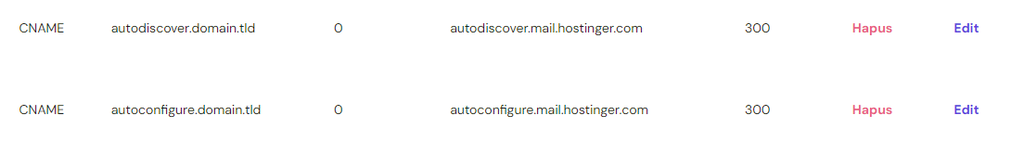 - Mengarah ke – autodiscover.mail.hostinger.com dan autoconfigure.mail.hostinger.com.