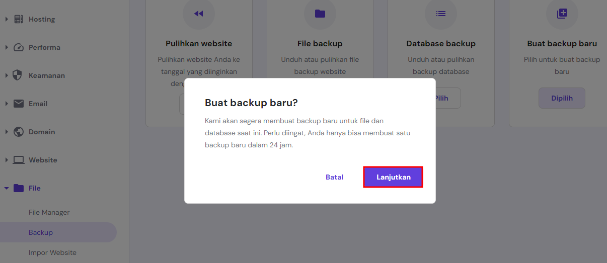 Apabila Anda adalah user Hostinger, Anda bisa membackup file website WordPress dan database melalui akun hosting:
