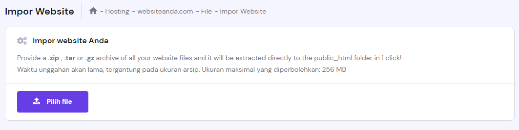 Bagi user Hostinger, tersedia fitur Impor Website yang bisa Anda temukan di hPanel. Anda bisa menggunakannya untuk mengekstrak arsip website ke direktori public_html. Tool ini mendukung .zip, .tar, dan .tar.gz, dengan batas upload 256 MB.