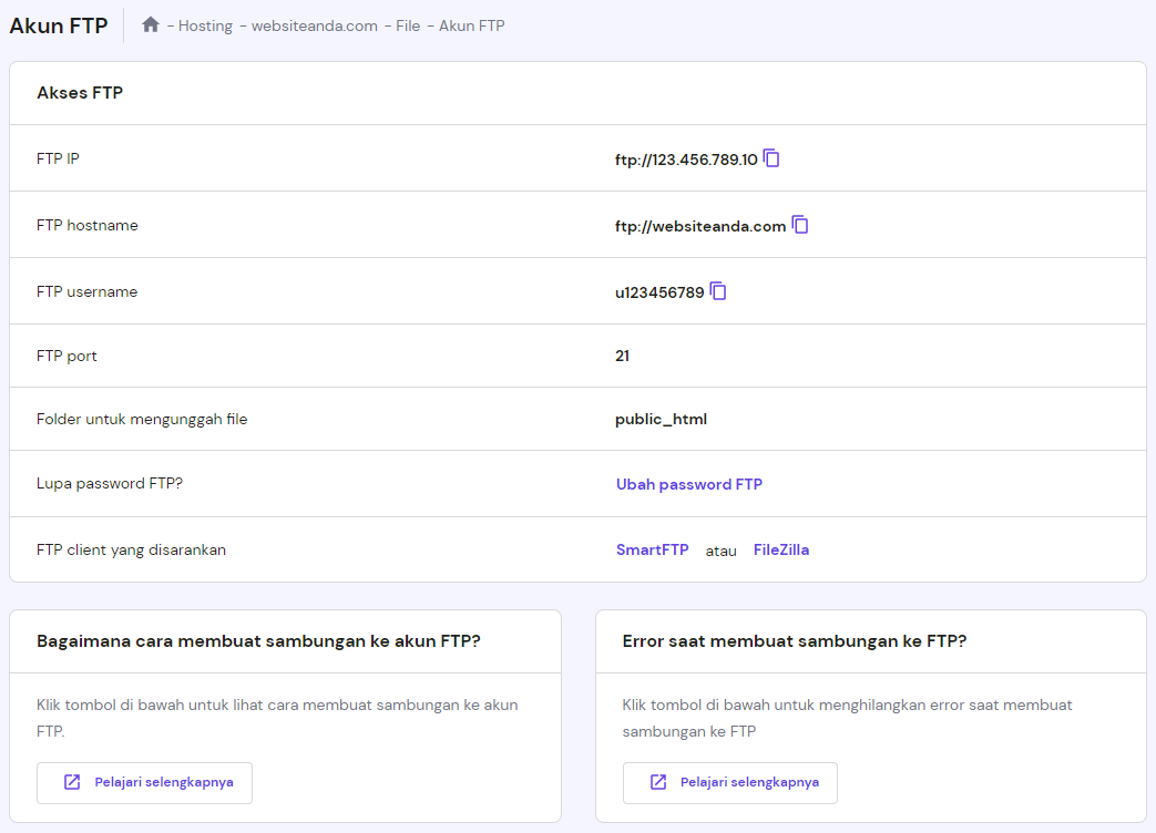 Di sini, Anda bisa menemukan semua informasi penting mengenai akun FTP Anda, seperti username, hostname, dan password FTP.