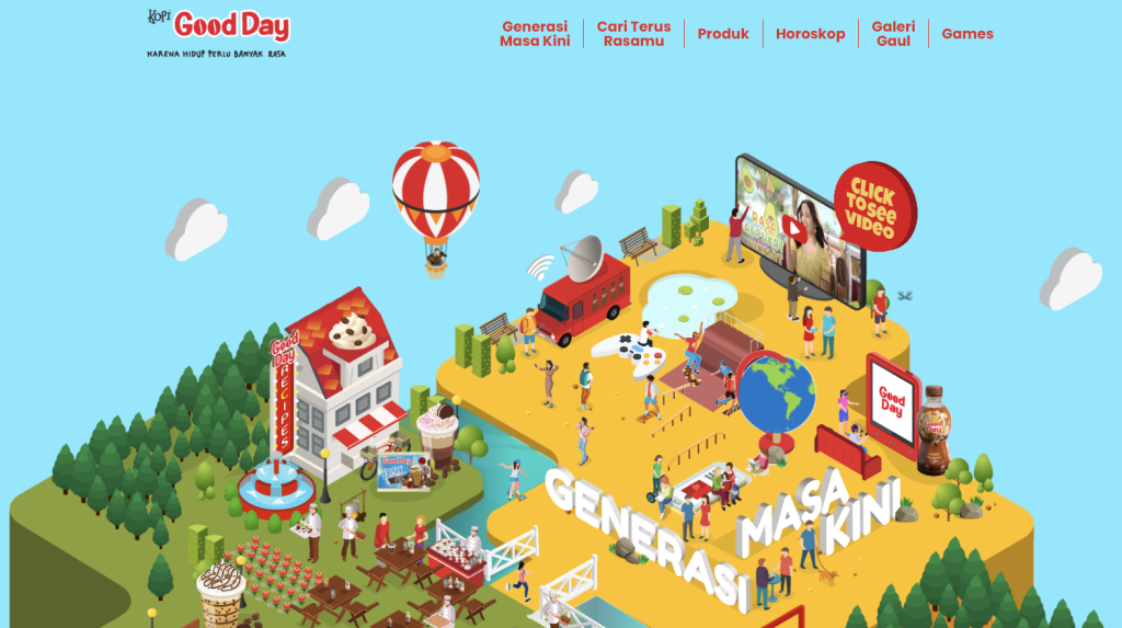 Desain website Kopi Good Day mencerminkan persona yang bersemangat, berjiwa muda, dan dinamis. Homepagenya menampilkan animasi lucu dengan gaya yang khas, dipadukan dengan skema warna-warna cerah.