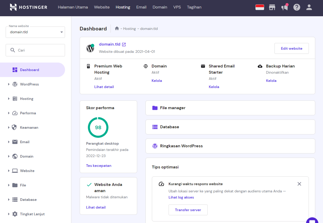 Sekilas tampilan hPanel mirip cPanel, tapi lebih mudah digunakan dan intuitif. Control panel ini juga tersedia dalam lebih dari 10 bahasa, termasuk bahasa Indonesia, Inggris, Spanyol, dan Prancis.