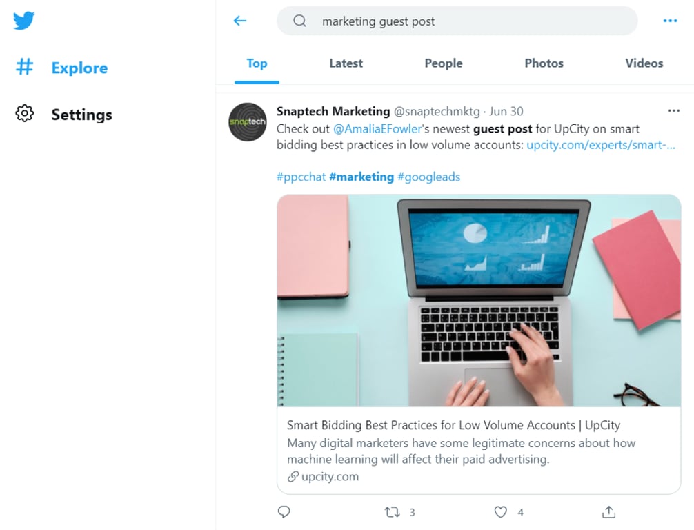 Kemudian, Anda juga bisa mencari kesempatan guest blogging di Twitter. Di kolom pencarian, masukkan kata kunci terkait niche Anda + istilah guest post. Berikut contoh hasil pencarian di Twitter: