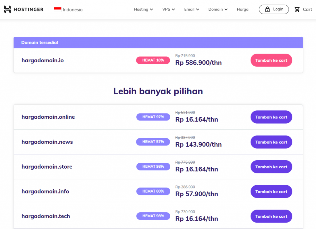Beli ekstensi .io dari provider dengan reputasi yang baik, seperti Hostinger. Semua nama domain dilengkapi dengan perlindungan privasi dan bantuan teknis 24 jam. Bahkan Anda bisa klaim domain gratis kalau membeli layanan hosting minimal 12 bulan.