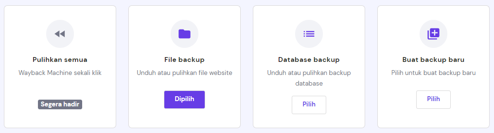 Beberapa layanan hosting menyediakan backup otomatis untuk website dan database Anda, apa pun CMS yang digunakan. Hostinger secara otomatis membuat backup mingguan atau harian, tergantung pada jenis hosting yang Anda gunakan.