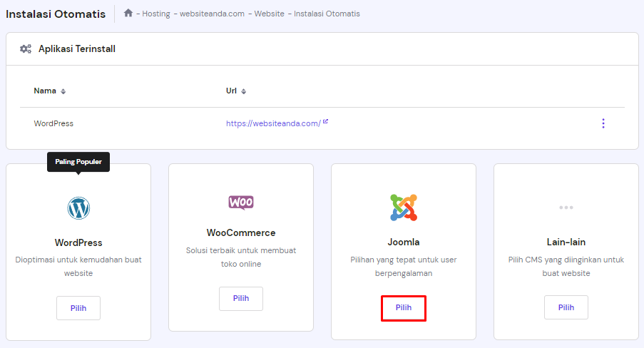 Di hPanel, user bisa mengakses instalasi otomatis pada menu Website. Kalau Anda menggunakan Joomla hosting, metodenya tidak jauh berbeda.