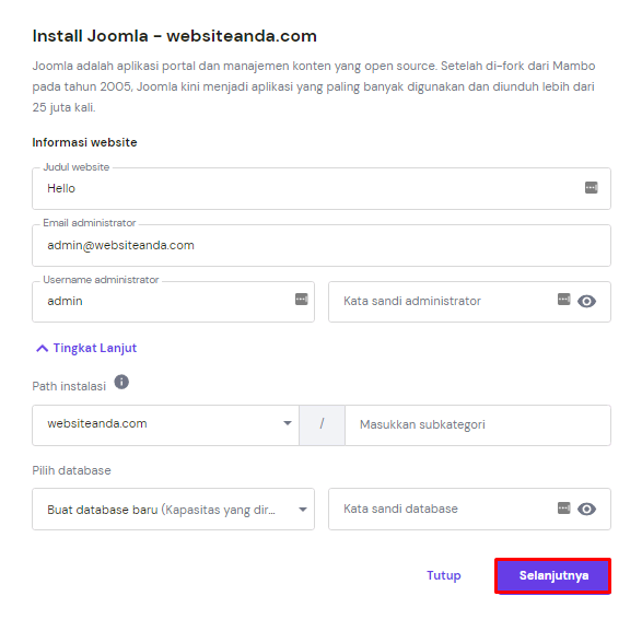 - Isi informasi yang diminta pada kolom yang disediakan, seperti email, username, dan password administrator. Setelah itu, klik Selanjutnya.