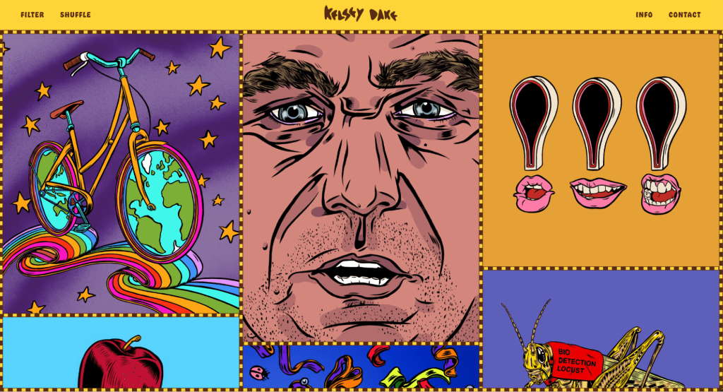 Portofolio Kelsey Dake menerapkan kombinasi warna kuning dan cokelat untuk menciptakan tampilan yang unik dan estetik.