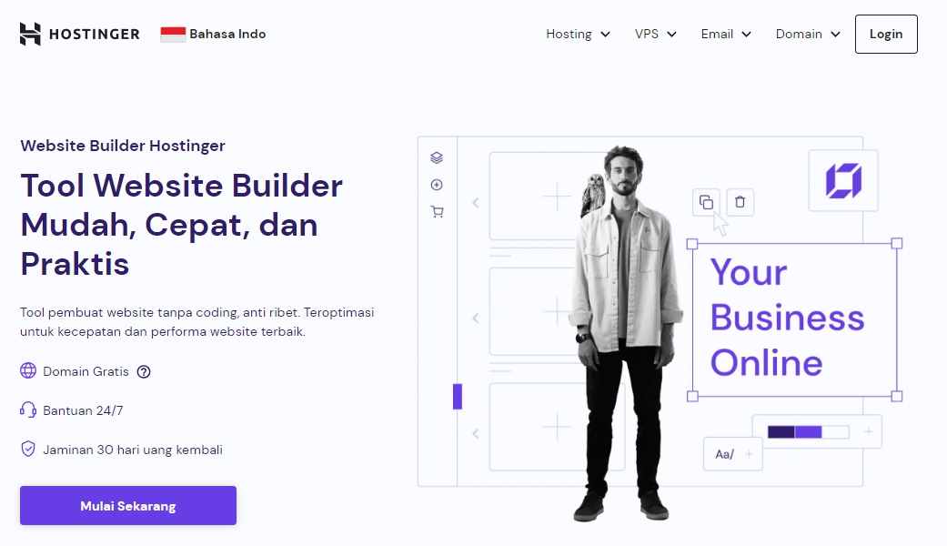 Anda bisa membuat landing page terpisah dengan tool builder dari Hostinger. Selain gratis dan mudah, tool ini juga tool ini juga telah dioptimalkan untuk membuat halaman landing yang ringkas dan memiliki tingkat konversi tinggi.