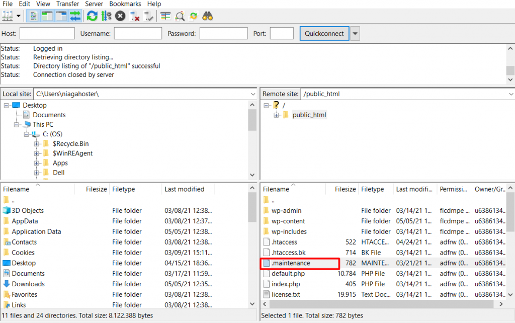 Apabila sudah familiar dengan klien FTP, Anda bisa memilih metode ini untuk menghapus file .maintenance dan menghilangkan tulisan Briefly unavailable for scheduled maintenance. Check back in a minute.
