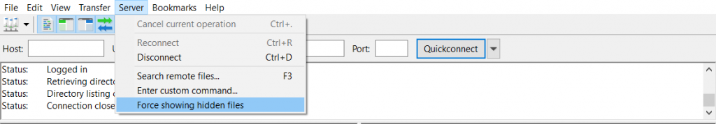1. Apabila Anda tidak bisa menemukan file tersebut, cek apakah konfigurasinya diatur ke “hidden” (tersembunyi). Tampilkan file dengan mengklik tombol Server di menu bar lalu pilih opsi “Force showing hidden files“.