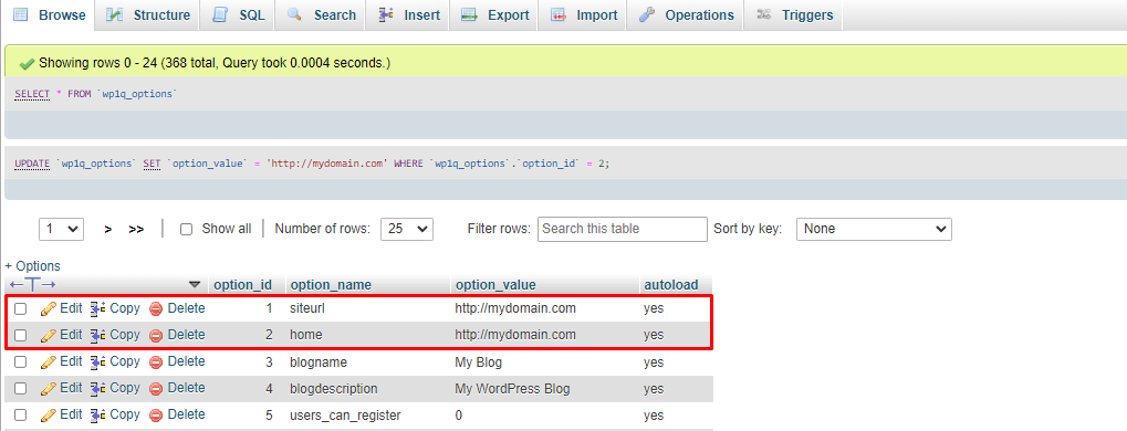 2. Pilih database website Anda dan temukan tabel wp_options. Di dalam wp_options, cari baris siteurl dan home. Pastikan keduanya mengarah ke URL yang sama.