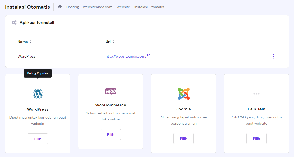 Anda bisa menginstal WordPress di hosting dengan mudah menggunakan instalasi otomatis. Proses setup pun menjadi lebih cepat karena sistem kami akan menangani sebagian besar konfigurasi teknisnya.