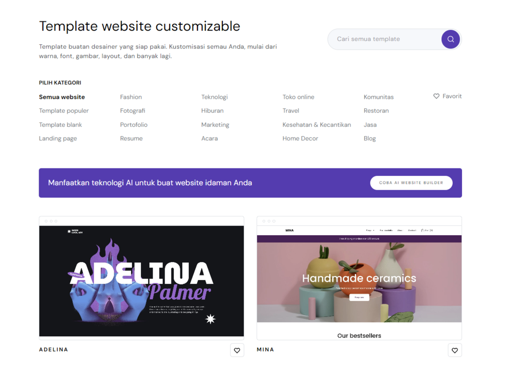 Ada banyak kategori yang bisa dipilih untuk berbagai niche, memastikan setiap pengguna bisa menemukan template website yang sesuai dengan kebutuhannya.