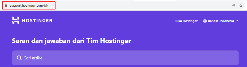 Sedangkan untuk halaman dukungan kami, yaitu support.hostinger.com, ada subdomain “support” yang dibuat khusus untuk halaman dukungan. Konten di halaman Support akan sangat berbeda dari halaman landing utama kami.