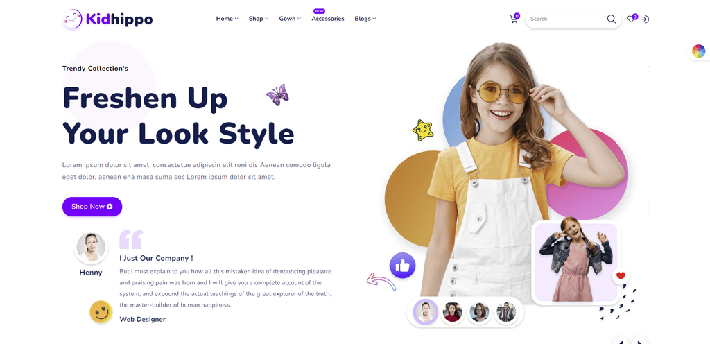 Kidhippo merupakan salah satu tema Shopify terbaik untuk toko pakaian anak-anak dan ibu hamil. Template e-Commerce yang dinamis dan lucu ini menyediakan opsi tampilan produk yang praktis seperti carousel dan animasi melayang, memudahkan pelanggan melihat-lihat item yang Anda tawarkan.