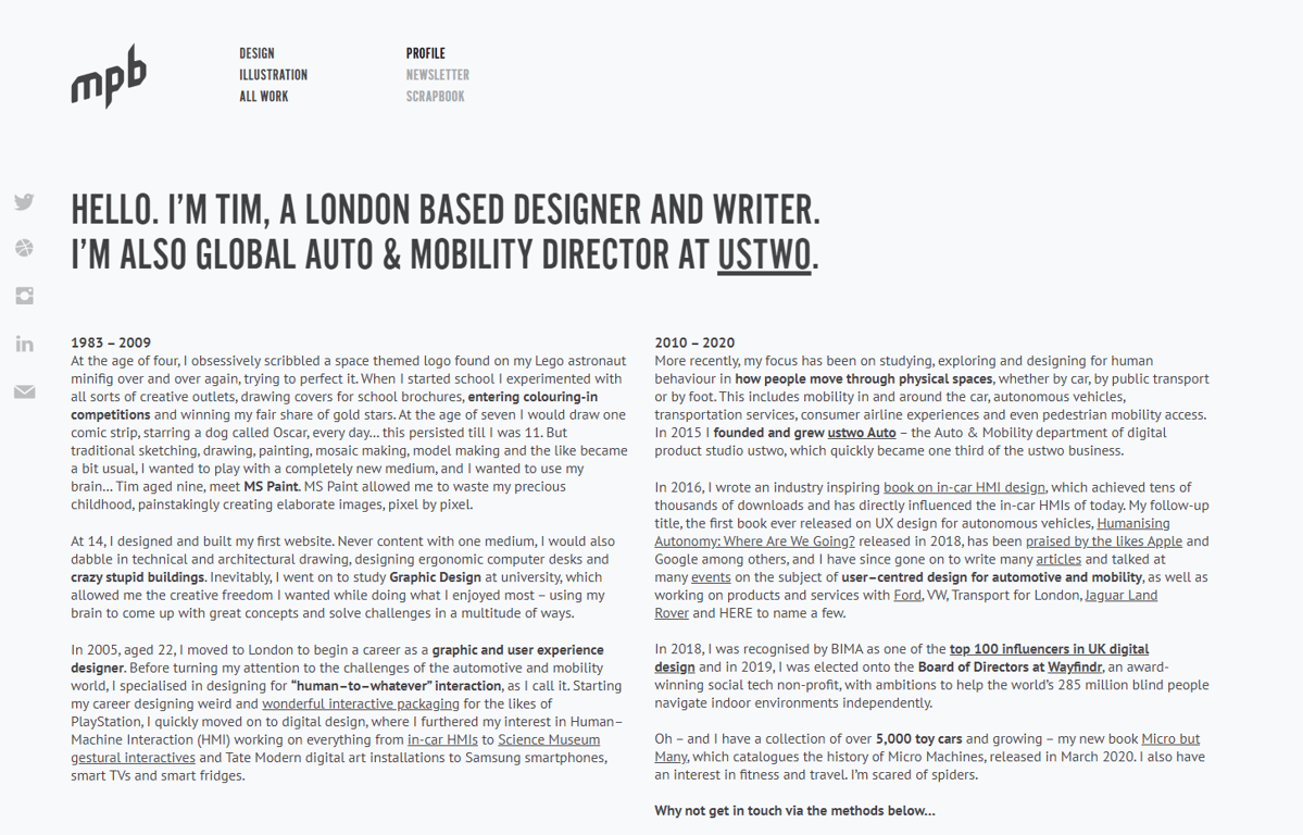 Selain itu, Anda bisa mencoba menggunakan sudut pandang orang ketiga. Meskipun terasa lebih profesional, Anda tetap boleh menyelipkan beberapa ‘fun fact’ tentang diri Anda. Contohnya ada Will Bryant di web portofolio desainnya yang menyertakan hobinya.