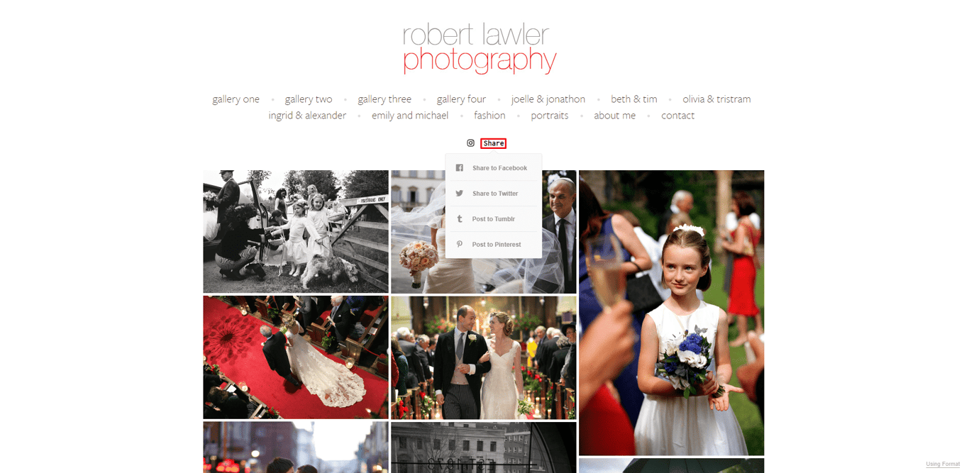 Tambahkan juga tombol like dan share di website untuk memudahkan pengunjung membagikan web portofolio Anda di medsos mereka. Sebagai contoh, fotografer Robert Lawler memiliki tombol share di menu utamanya.