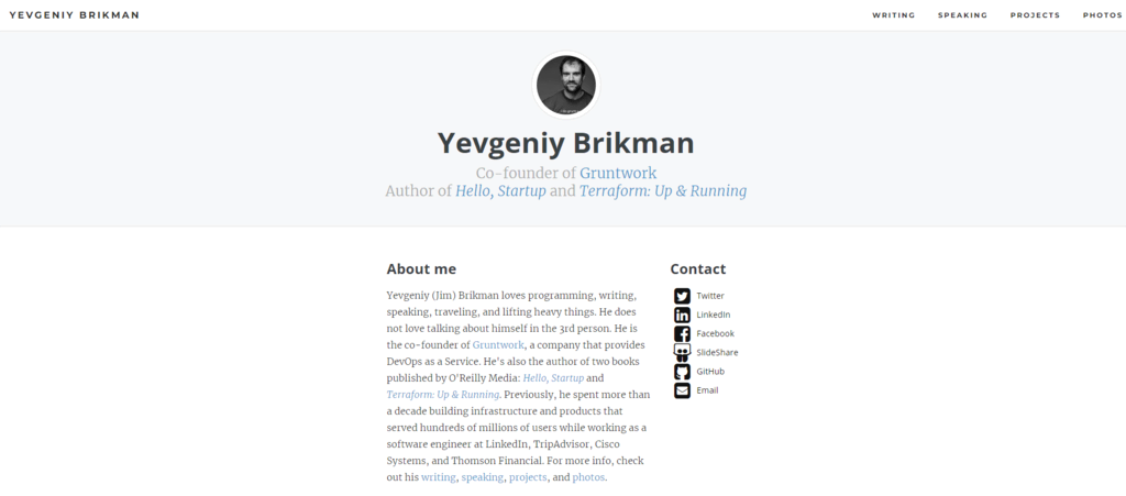 Take a look at this web developer portfolio website from Yevgeniy Brikman.