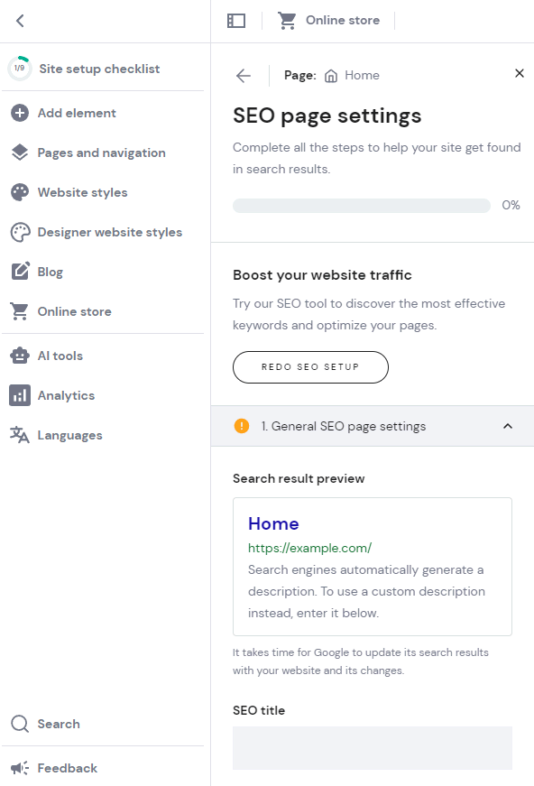 - Go to Website settings → SEO to make an SEO-friendly website.