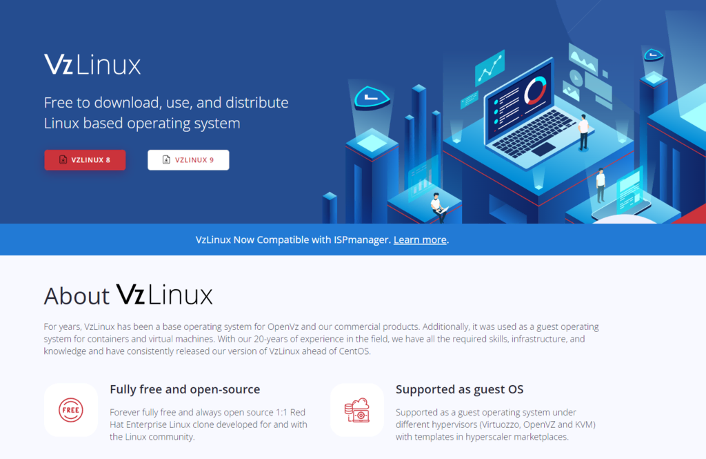 Known as the CentOS clone for virtualization, VzLinux is the base operating system for OpenVZ technology developed by Virtuozzo International GmbH. It aims to consolidate workloads by reducing the number of physical servers.