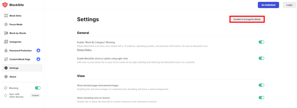 If you want to prevent access to the websites on your block list in Chrome’s incognito mode, click on the gear icon for the extension Settings, then click on the Enable in Incognito Mode button.