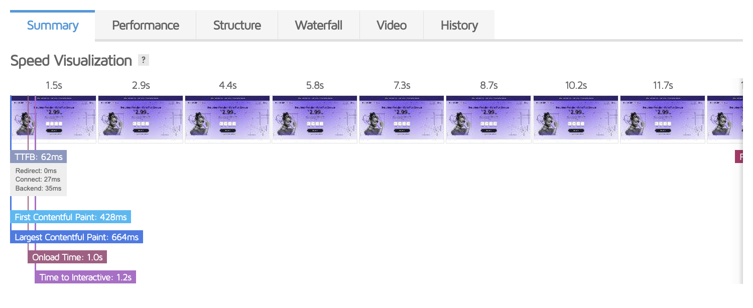 You can also view this information if you need to know the Core Web Vitals scores. Right below TTFB, you’ll see the First Contentful Paint and Largest Contentful Paint scores. On the right, check the Fully Loaded Time.