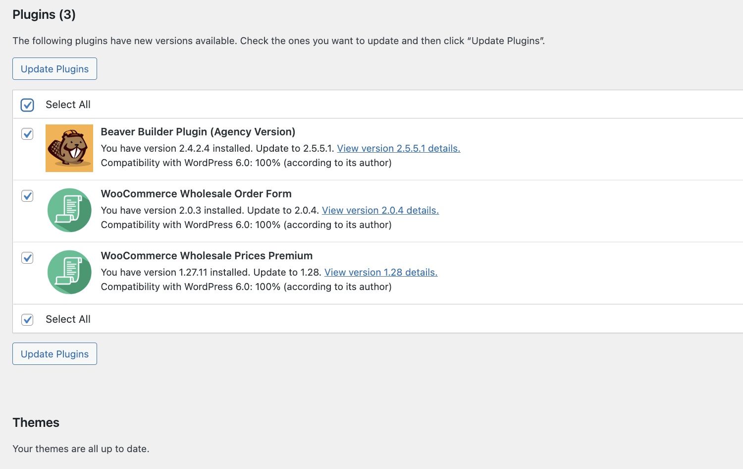 You’ll also be able to update your plugins and themes. You can simply check the box next to each and install the newest versions.