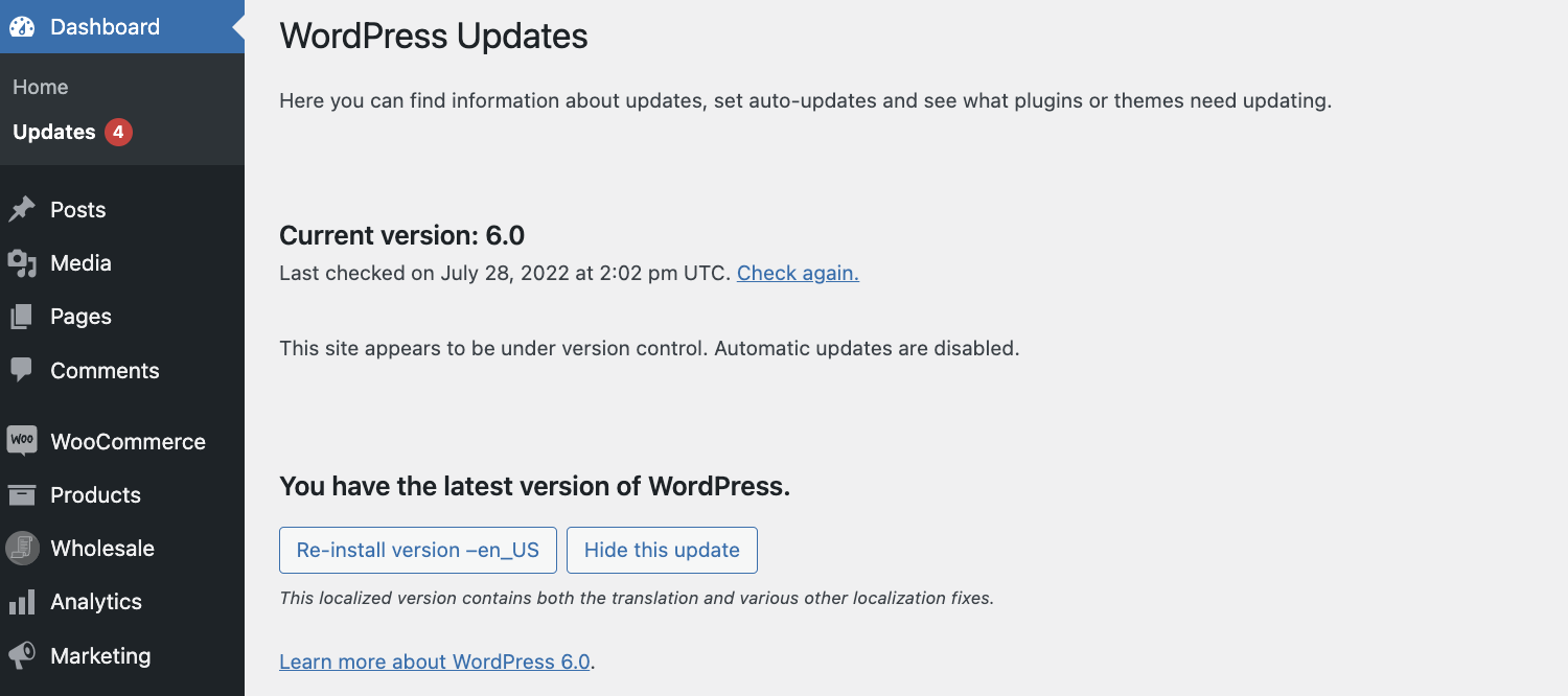 To see if there are any available updates, open your WordPress dashboard and click on the Updates page. Here, see if you need to install a new version of WordPress.