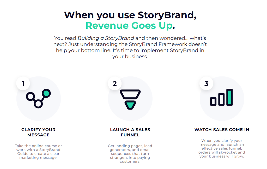 The goal of this process is to help customers envision success and make sure they understand how you can help them get there. As the name implies, StoryBrand is all about storytelling. If you can figure out how to tell a good story about your product, you can sell it, too.
