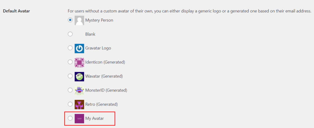 - Go to Settings → Discussion. If the process was successful, the custom profile picture will be available on the Default Avatar options.