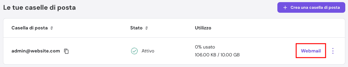 In alternativa, accedi a hPanel e vai su Email → Gestisci accanto al tuo indirizzo email. Nella dashboard Account email, seleziona Webmail.