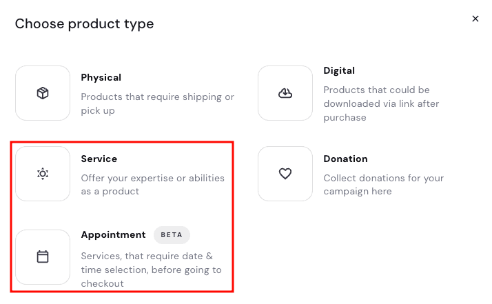 Sempre nella pagina di configurazione del negozio, puoi aggiungere il tuo primo prodotto. Clicca su Aggiungi prodotto e scegli tra Servizio o Appuntamento per consentire ai clienti di prenotare i tuoi servizi fotografici.