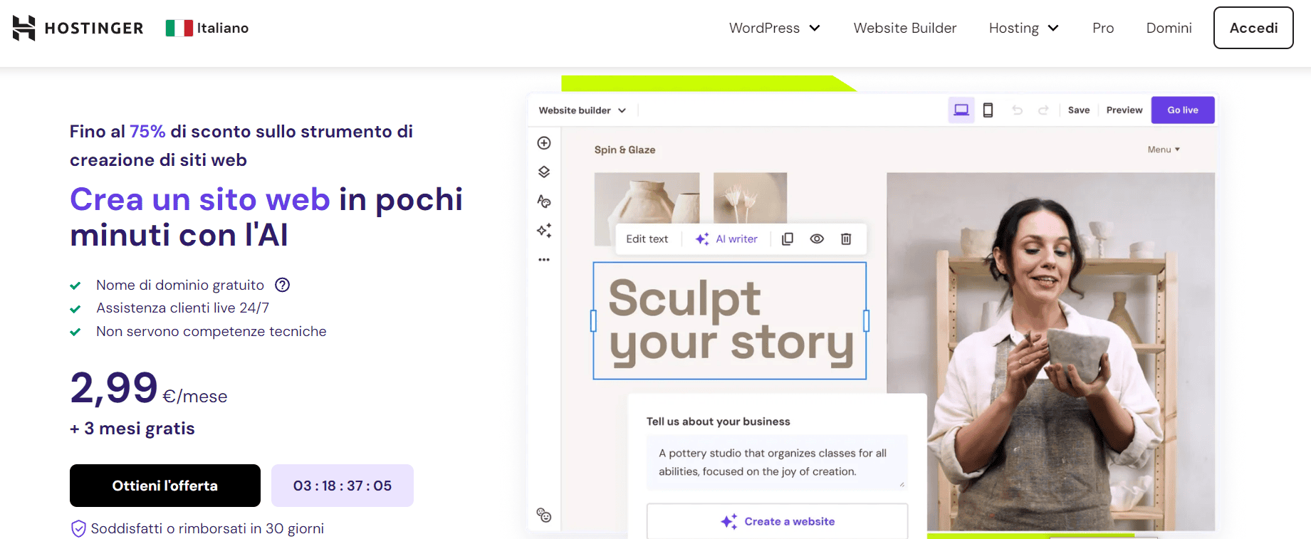 Oltre a numerosi bellissimi template, l’editor drag-and-drop e gli strumenti di IA, il Website Builder di Hostinger offre ampie funzionalità di eCommerce e marketing. Viene anche fornito con un nome di dominio gratuito, certificati SSL e larghezza di banda illimitata.