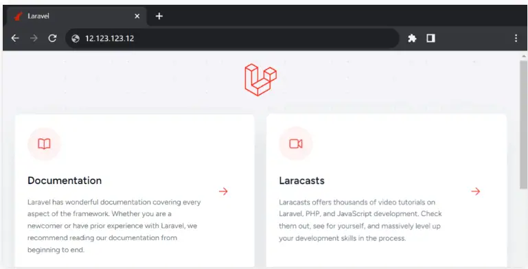 Una volta completato il processo di distribuzione, inserisci l’indirizzo IP del tuo VPS o il nome del dominio in un browser web per controllare se l’applicazione funziona correttamente. Se i file sono vuoti, dovresti vedere la pagina di benvenuto di Laravel.