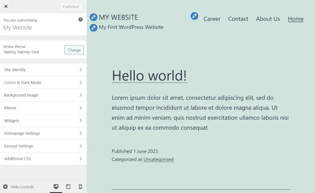 Ad esempio, Twenty Twenty-One di WordPress permette di modificare il colore e l’immagine di sfondo, ma non ci sono impostazioni integrate per cambiare il font. È comunque possibile inserire codice CSS personalizzato per farlo.