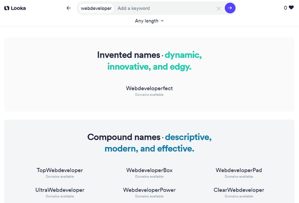 Inizia a generare idee digitando parole chiave nel campo di ricerca e determinando il limite di caratteri. Lo strumento mostrerà tre risultati categorizzati: nomi inventati, nomi composti e nomi composti da più parole.