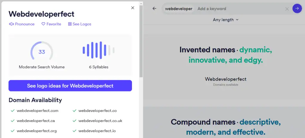 Se clicchi su un risultato qualsiasi, una barra laterale pop-up apparirà sul lato sinistro della finestra. Questa mostrerà informazioni dettagliate sul nome: la sua pronuncia, la disponibilità del dominio con varie estensioni e la disponibilità del nome utente sui social media.