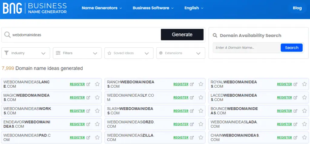 Business Name Generator offre idee per nomi di dominio e numerosi strumenti di filtraggio per restringere i suggerimenti generati.