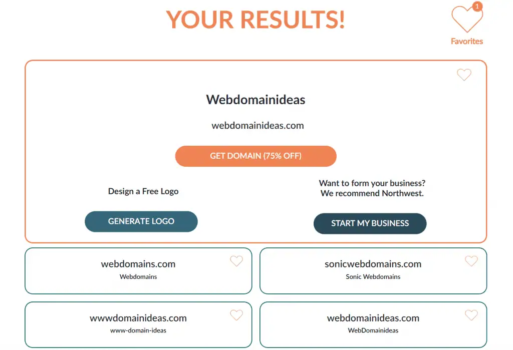 Avrai la possibilità di vedere più domini o di visualizzare tutti i risultati scorrendo verso il basso. Clicca sull’icona a forma di cuore su qualsiasi risultato per salvare le opzioni di nome di dominio che ti piacciono.