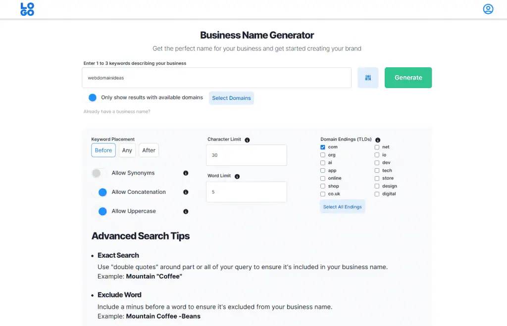 Se stai ancora cercando un nome aziendale, LOGO.com offre impostazioni avanzate per la tua ricerca. Utilizzando questo generatore, puoi limitare la ricerca aggiungendo limiti di caratteri e parole, scegliendo i TLD preferiti e consentendo sinonimi.