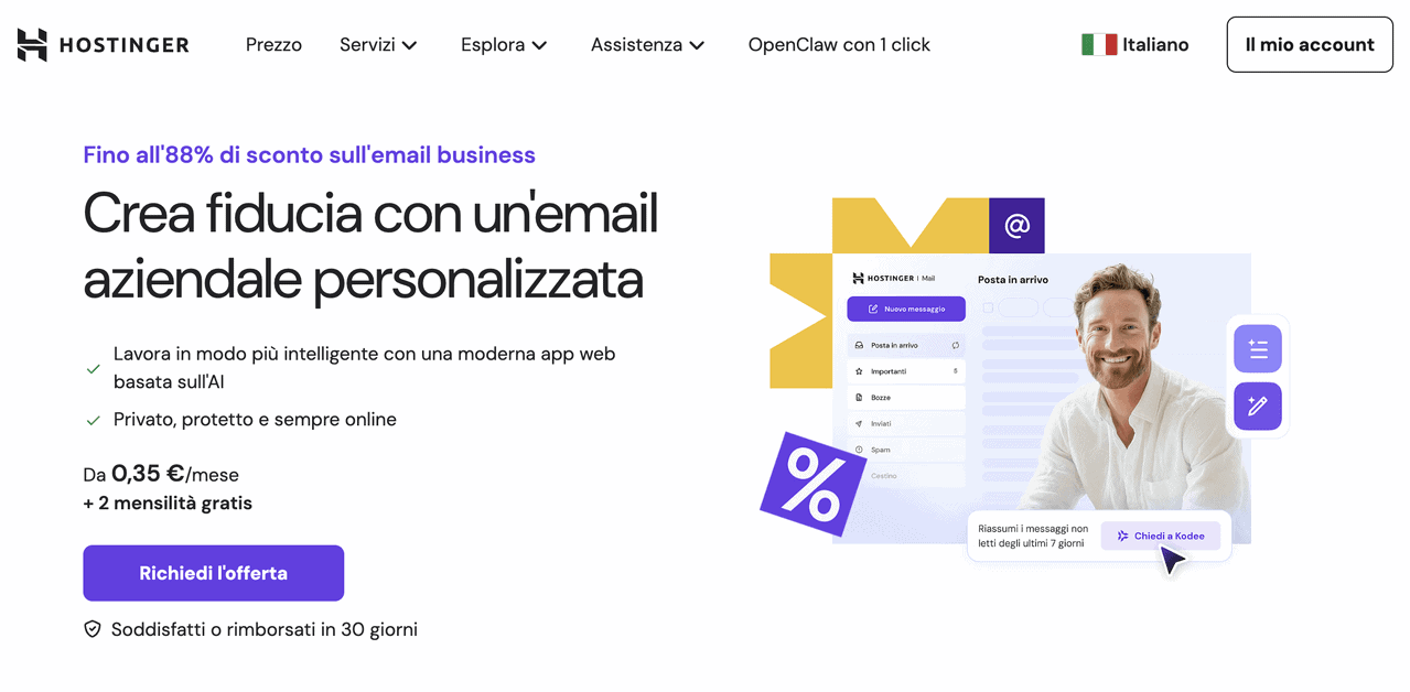 Hostinger è un fornitore di hosting email conveniente, pensato per piccole imprese e imprenditori. Anche con un prezzo di partenza contenuto, offre funzionalità complete per creare e gestire le email aziendali.