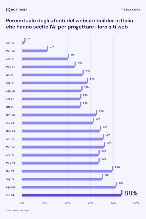 Esistono strumenti AI-driven che aiutano le aziende a migliorare la loro efficienza, stimolano l’innovazione e riducono i tempi di sviluppo dei progetti. Secondo i dati Hostinger di settembre 2024, circa l’88% degli utenti italiani preferisce utilizzare l’AI Builder per progettare e ottimizzare i propri siti web, una percentuale in continua crescita. Questo dimostra come la fiducia e l’affidabilità verso gli strumenti di AI siano in costante aumento.