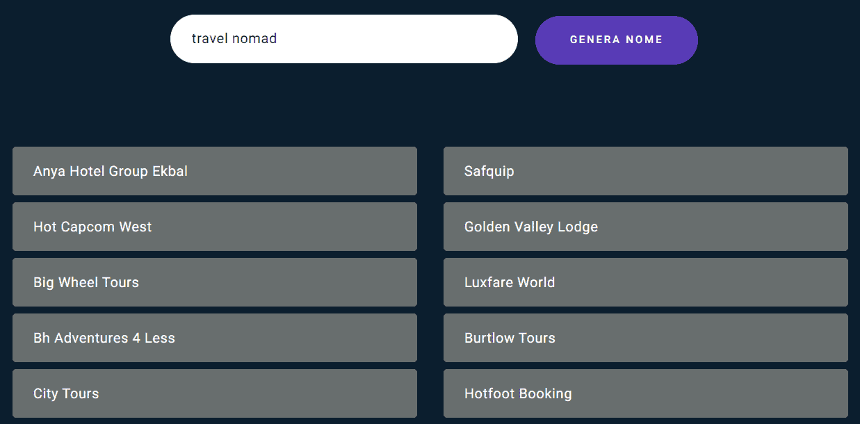 Un generatore di nomi aziendali è utile anche per trovare un nuovo nome. Ad esempio, quando si inserisce la parola chiave “travel nomad”, lo strumento elenca diverse idee.